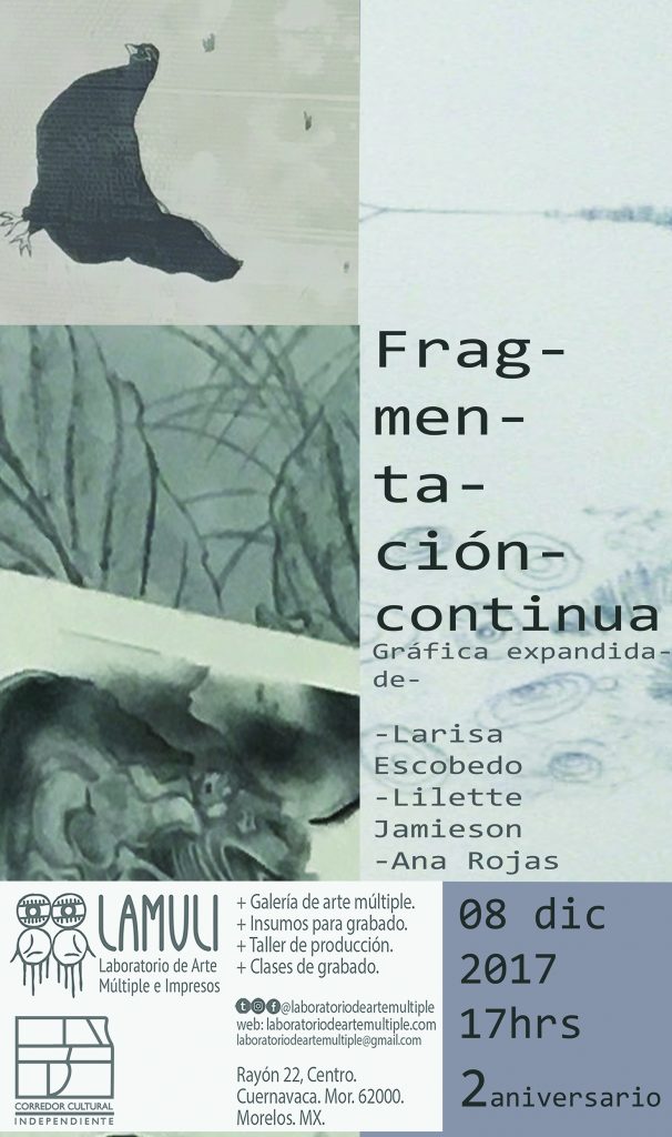 En el marco del Corredor cultural independiente 2017 y para celebrar el segundo aniversario de LAMULI, el laboratorio presenta una exposición sobre gráfica experimental en la que se incluyen trabajos de las artistas Larisa Escobedo, Lilette Jamieson y Ana Rojas. La muestra busca ofrecer un acercamiento experimental a las técnicas de gráfica al expandir el espacio de la galería.
