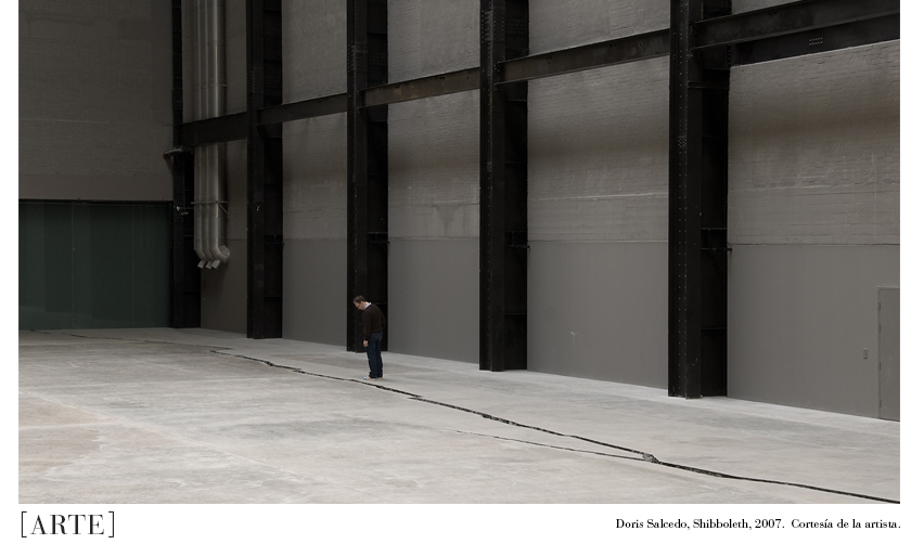 Una de las piezas más significativas de la artista es Shibboleth, una escultura monumental que consistió en una intervención arquitectónica al Salón de Turbinas del Tate Modern en Londres en 2007. La palabra hebrea shibboleth remite a la acción de marcar distinciones entre razas, aparece en un pasaje bíblico en el que los galaaditas usan la palabra para distinguir a los suyos de la tribu efradita; al cruzar el Río Jordán solo aquellos que podían pronunciar correctamente la primera sílaba de la palabra vivían. Shibboleth de Salcedo, consistió en una grieta en zigzag de 167 metros sobre el piso de la galería que, conforme avanzaba, se hacía más profunda y más ancha. Con esta pieza la artista hace referencia a las divisiones sociales y raciales, señalando cómo en pleno siglo XXI –3000 años después de que la expresión fuera acuñada– estas distinciones siguen siendo vigentes y las personas siguen asesinado a todos aquellos que no pertenecen a determinada tribu. Solo con ver las fotografías uno puede sentir la escalofriante sensación de experimentar un espacio no seguro, que en cualquier momento se va a desmoronar. Se puede percibir el poder de la intransigencia y la injusticia haciendo retumbar las bases de la convivencia armoniosa y poniendo en tela de juicio el sentido de humanidad.