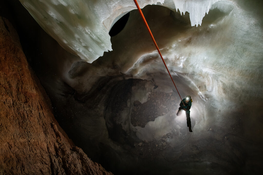 Moseley asciende por encima de un glaciar en lo profundo de Dachstein Rieseneishöhle, una cueva de hielo gigante en los Alpes austríacos. Fotografía vía Premios Rolex al Emprendimiento. https://on.rolex.com/3JU0o0f