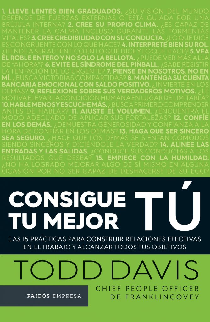 En Consigue tu mejor tú, Todd Davis, experto en recursos humanos y liderazgo de la multinacional FranklinCovey, comparte algunas reflexiones sobre su experiencia como director de relaciones humanas y vicepresidente ejecutivo. Señala más de una decena de hábitos y ejercicios que las personas en niveles directivos pueden poner en práctica a fin de mejorar y potenciar las relaciones humanas que se establecen en los espacios de trabajo. En última instancia, este trabajo recuerda que las personas son el mayor activo de una organización y que unidas la harán llegar más lejos.