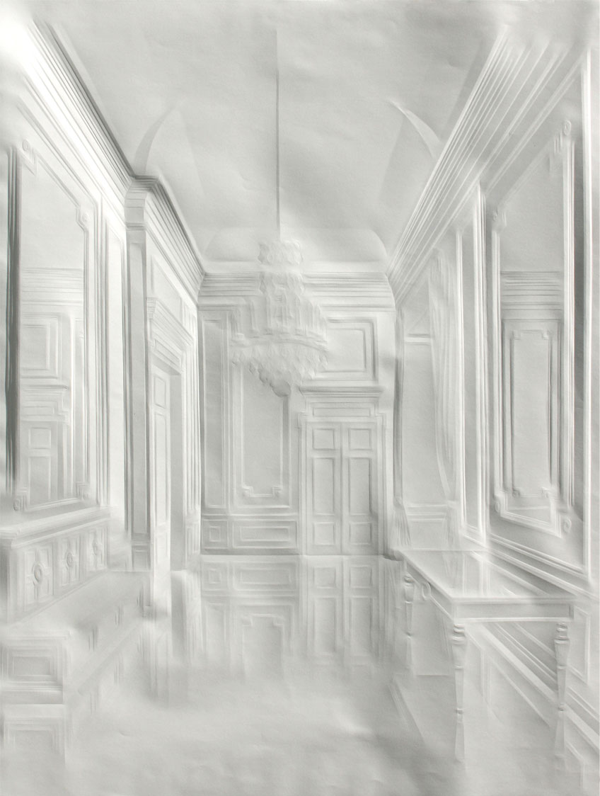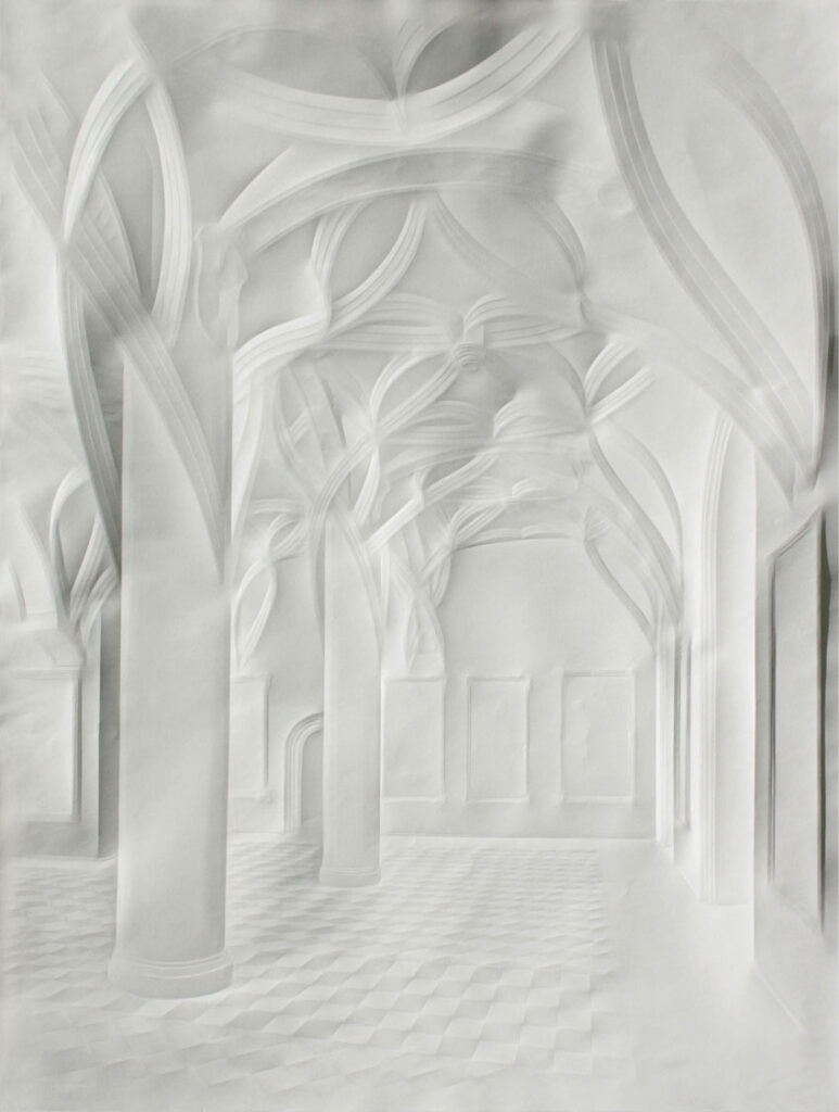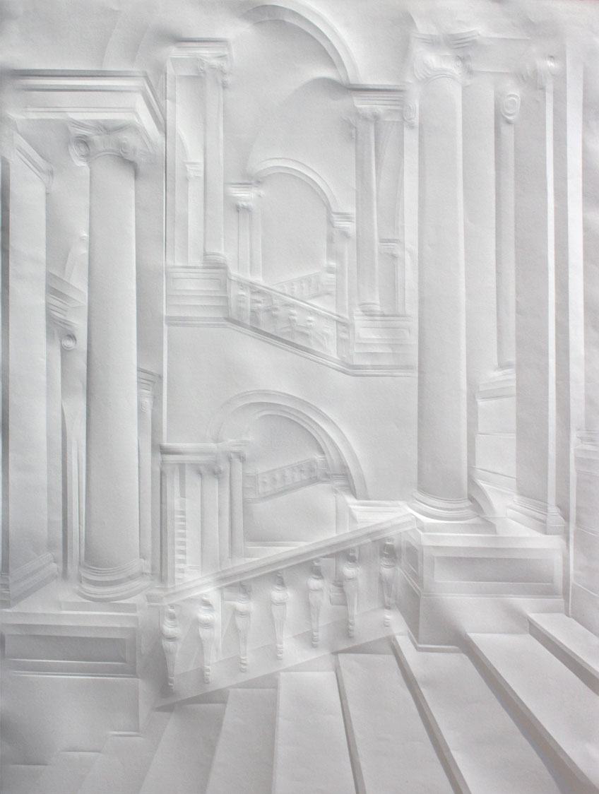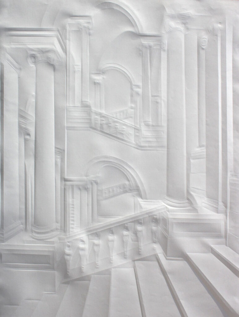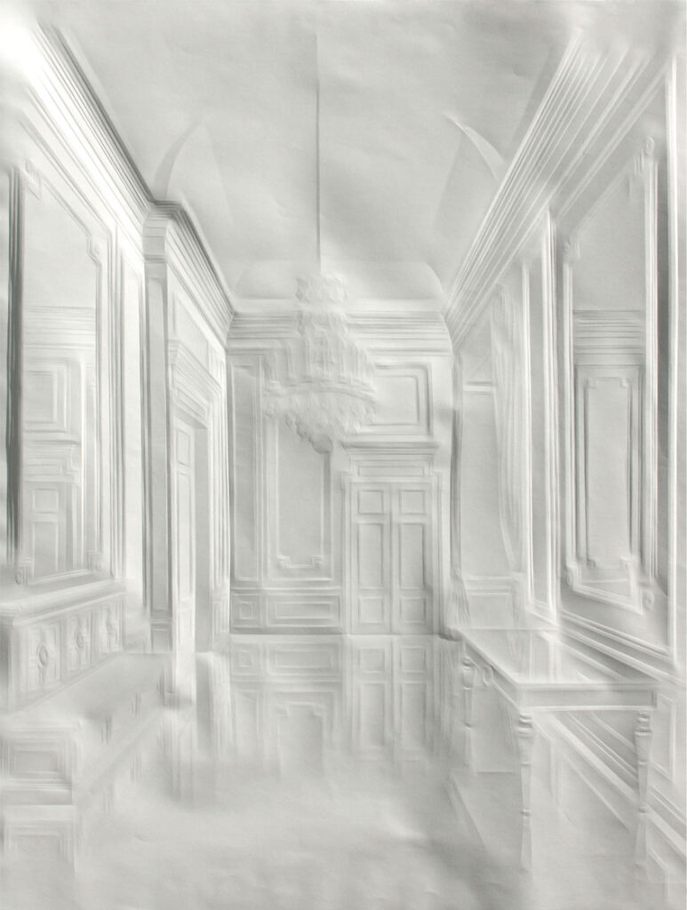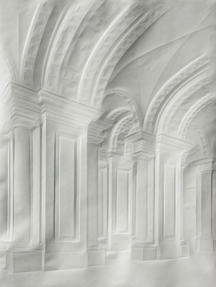 La obra de Simon Schubert emerge del papel, no como trazos realizados con lápiz o tinta sino por medio de dobleces minuciosamente generados, produciendo la ilusión de los volúmenes arquitectónicos de diversos espacios que se muestran como puertas abiertas a la imaginación.