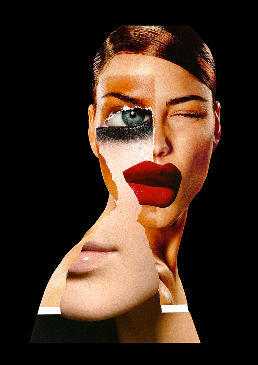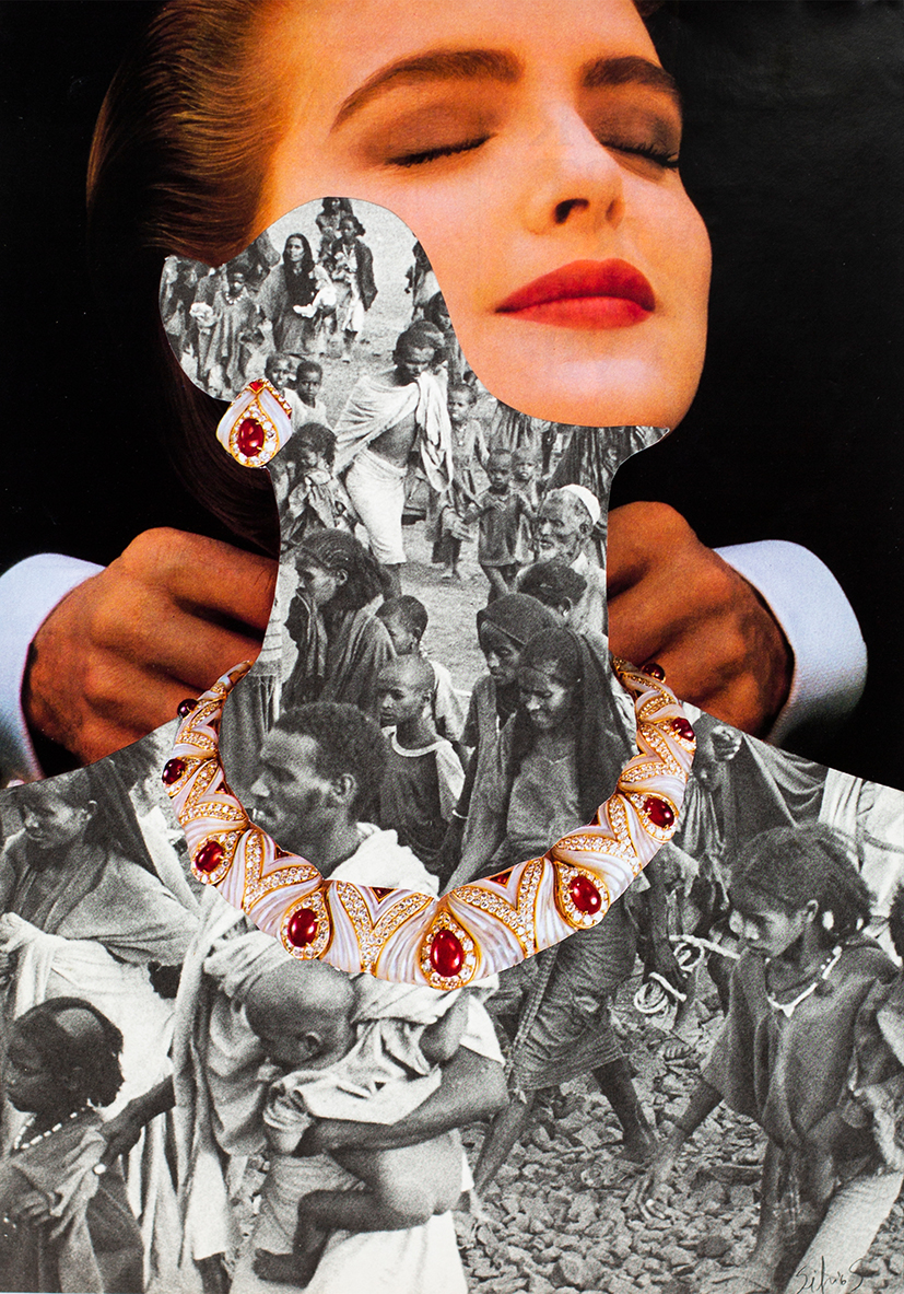 En una tónica similar, la construcción social de lo femenino también pasa por la lupa y se desmantela en sus collages. Lips es un comentario sobre la obsesión con la apariencia física y la incansable búsqueda de belleza que termina en tratamientos estéticos y cirugías plásticas. Eyes for Fashion también parte de la idealización de la belleza femenina. “Las lentes de las cámaras simbolizan los ojos de los jóvenes que viven en las redes sociales”, comenta Silvio. Por su parte, It Feels Good to Be So Rich!! hace referencia a la inequidad económica y “critica la idea del consumismo y el lujo como forma de bienestar. La modelo experimenta un placer casi espiritual al usar las joyas, en contraste con el sufrimiento y el desplazamiento causado por la migración forzada”, dice al respecto. Silvio está consciente de las contradicciones de una sociedad ensimismada que vive para la mirada ajena y no teme subrayarlas, sin perder el guiño humorístico que caracteriza su propuesta.