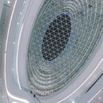 Descendamos a los tres niveles más bajos del Galaxy Soho, donde se localizan los espacios públicos para las compras y el esparcimiento. El mismo sentido de los trazos, como una cadencia oceánica o eólica en las curvas, los materiales que emergen a la vista como los anillos concéntricos revestidos de aluminio, los cristales y los andadores elevados.